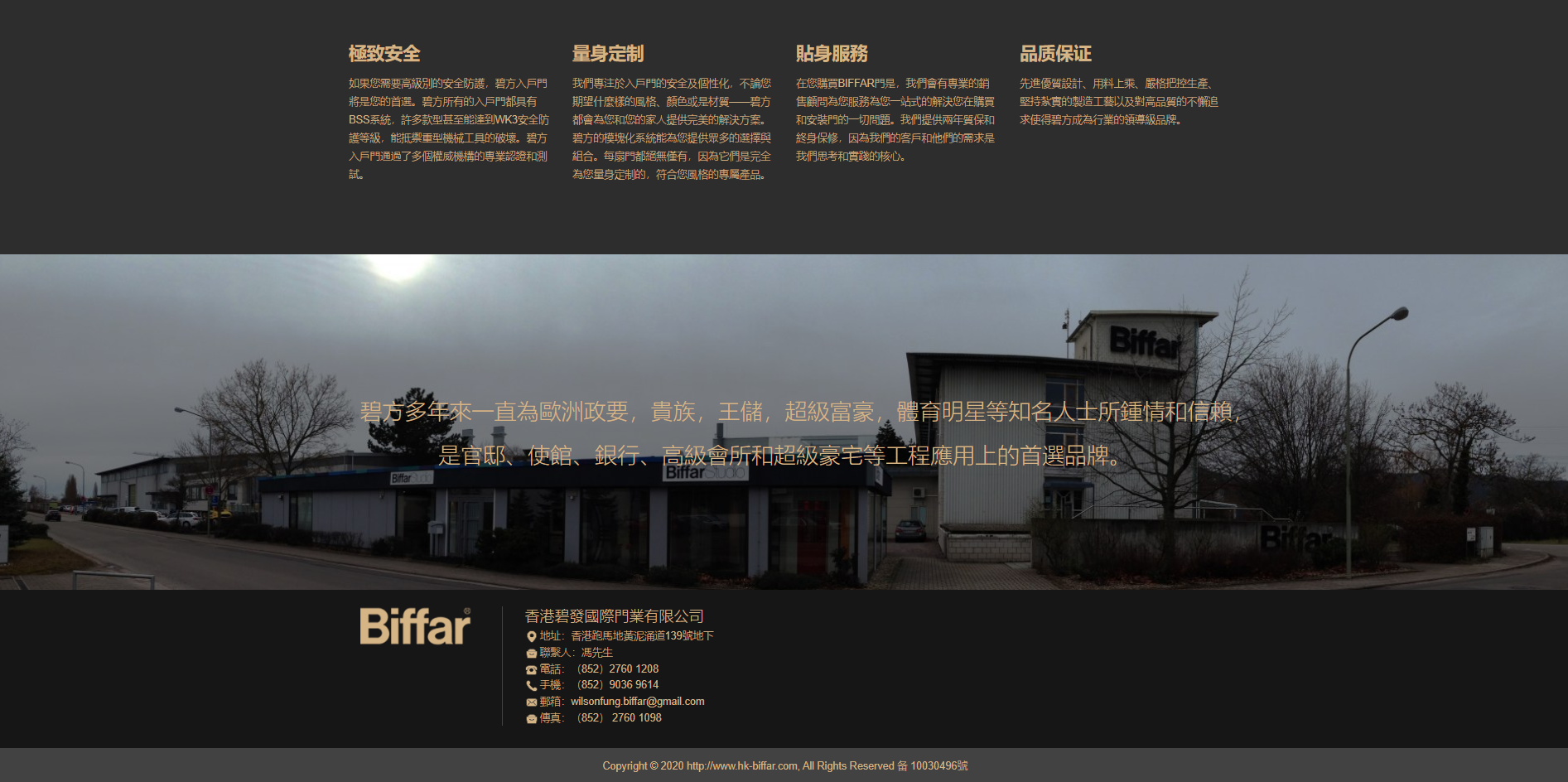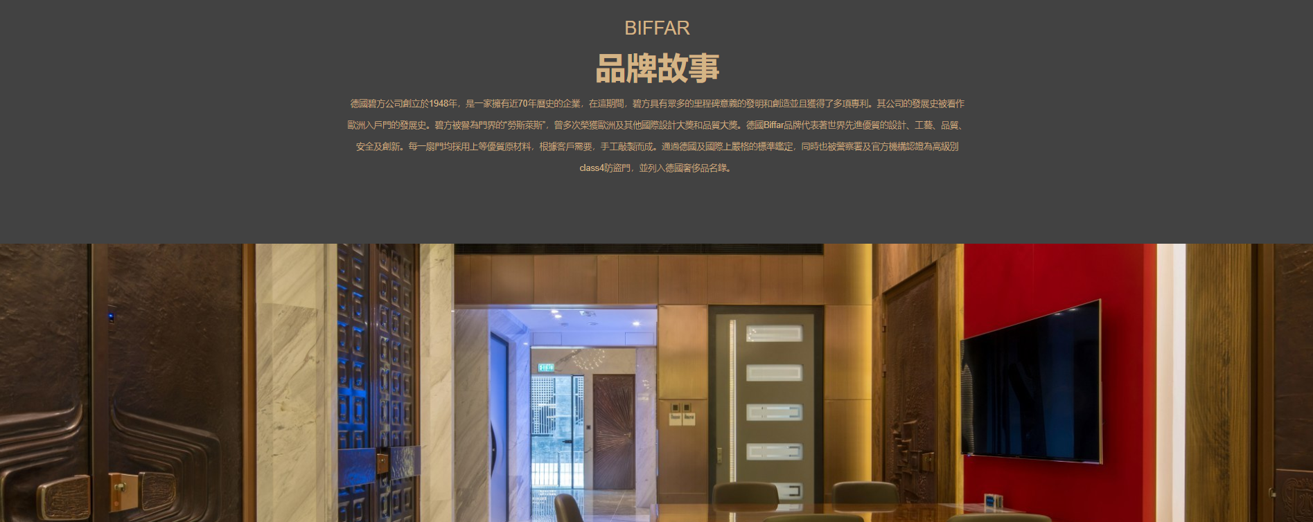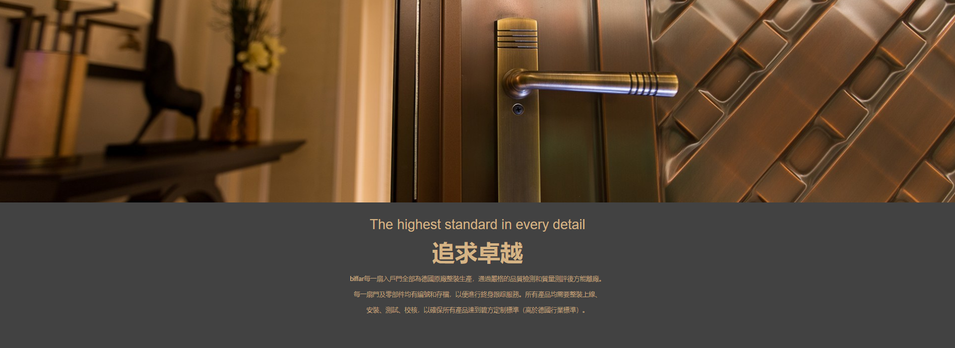 深圳碧發商貿有限公司是經德國Biffar集團(Biffar GmbH & Co.KG)官方授權的專業代理(lǐ)商。有權在中國及港、澳地區銷售德國Biffar集團產品。 Biffar產品為行業的翹楚,為政要、貴族、王儲、超級富豪、體育明星等頂級人(rén)士所鍾情和信賴,同時也贏得(de)政府、企業及地產開發商的青睞,多次應用在使館、官邸、銀行、頂級會所標誌性建築及超級豪宅等工(gōng)程上。Biffar入戶門的發展歷史也是德國乃至歐洲入戶門發展的歷史,同時也開創了德國安全入戶門的標準,始終為行業的開創者及領導者。